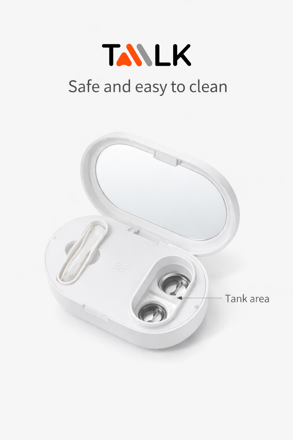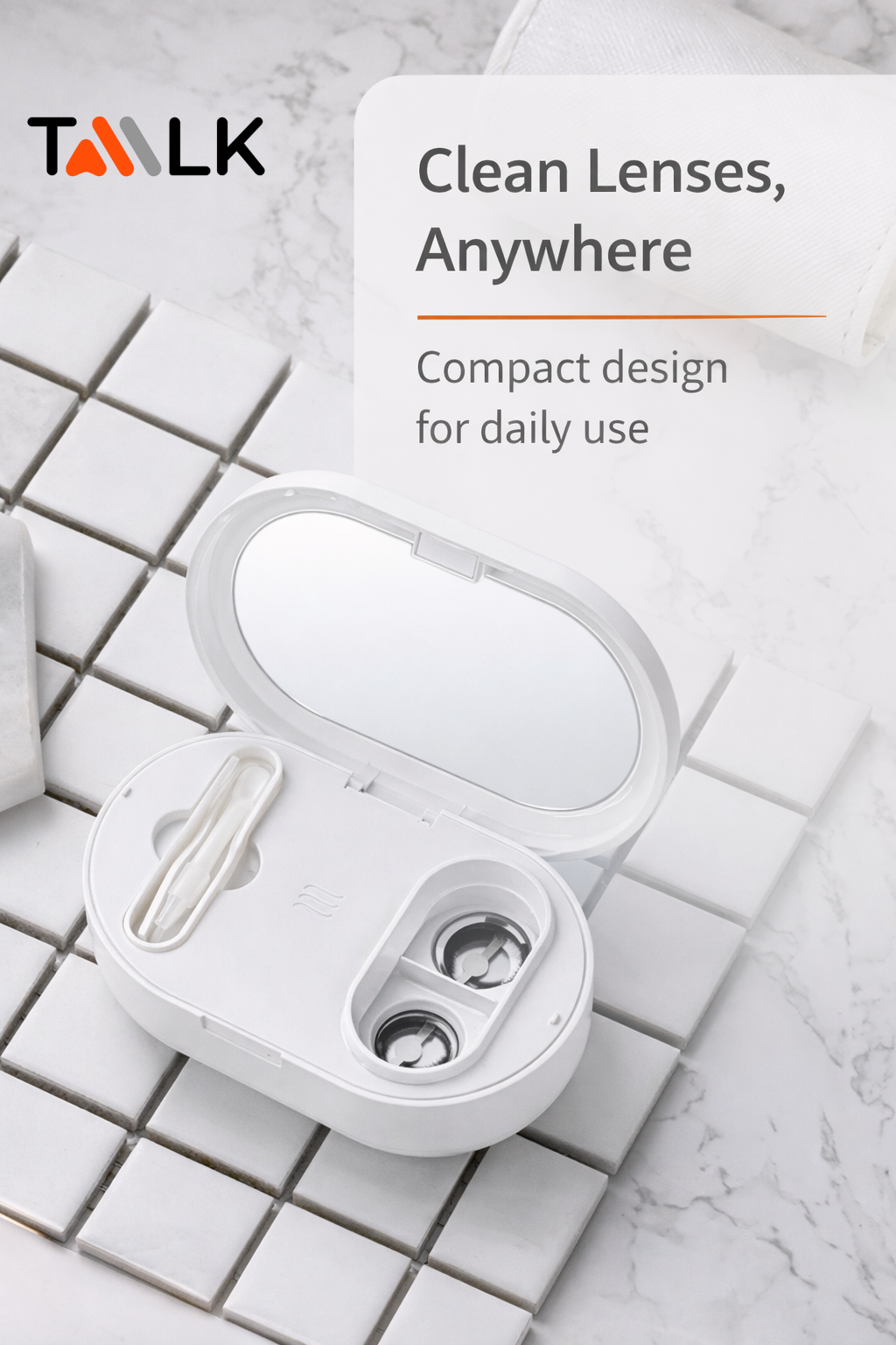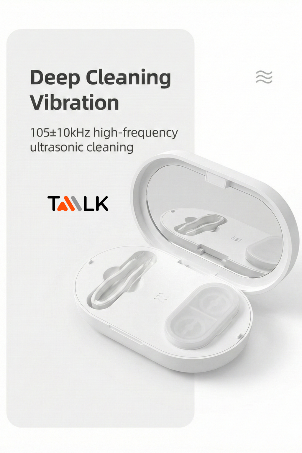 The EraClean Ultrasonic Contact Lens Cleaner uses 105±10kHz high-frequency vibration to support deep cleaning by loosening daily residue such as dirt, particles, and protein deposits.